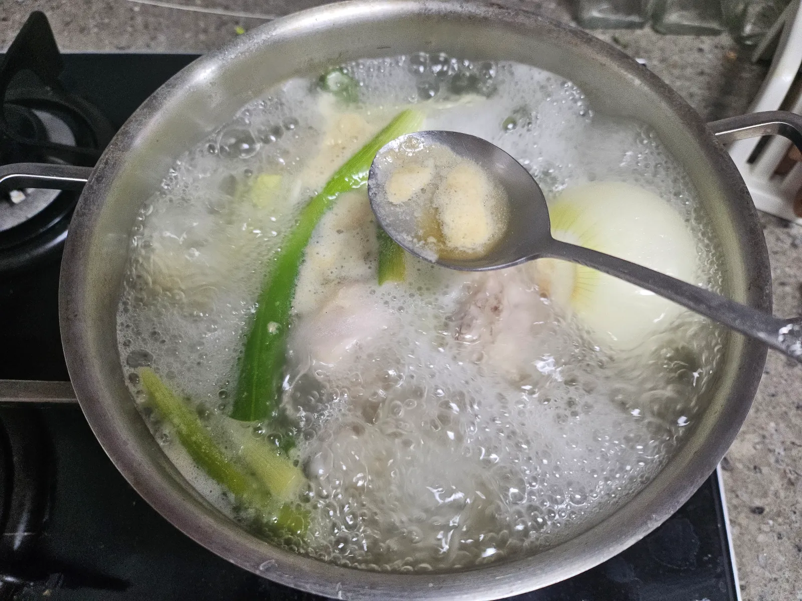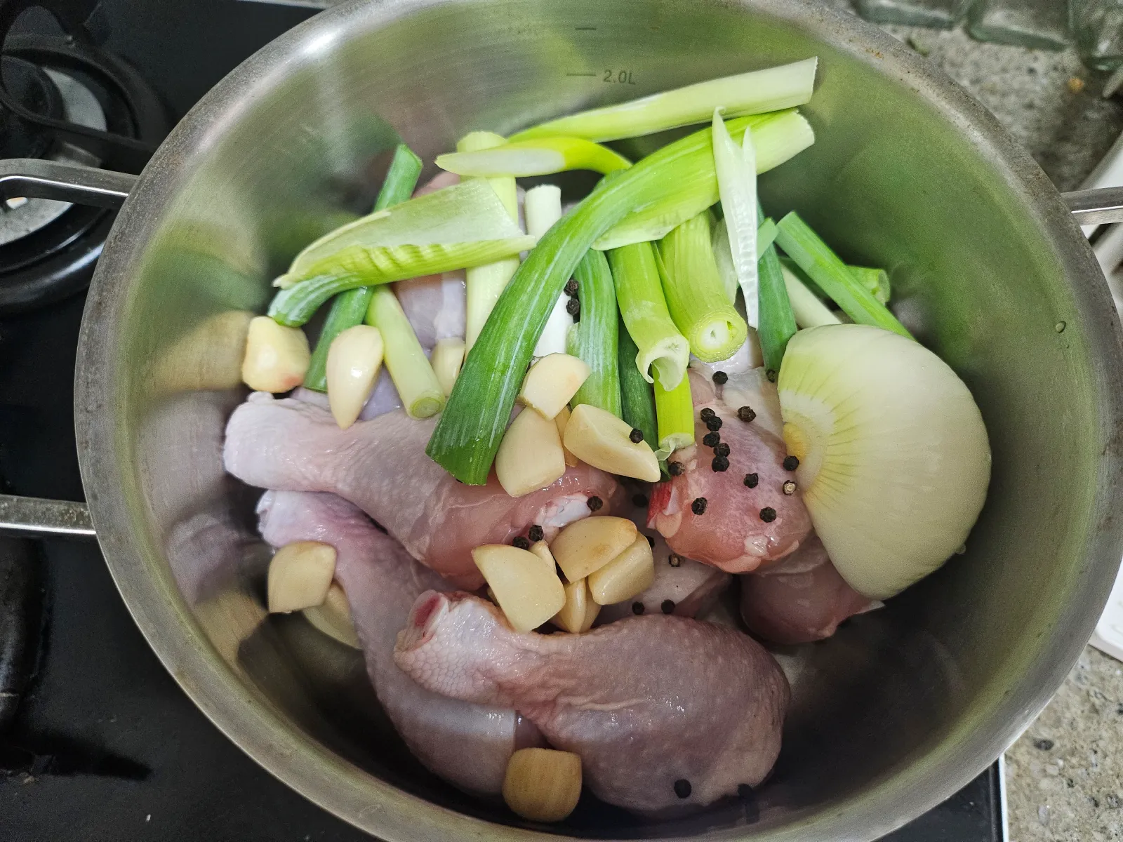 🍗냄비에 닭다리(800g)을 담고 ((물2L, 양파 1/2개, 대파 흰 부분 3대, 통마늘 10알, 통후추, 치킨스톡 2스푼)) 넣고 뚜껑을 열고 끓인다. 물 2L가 전부 안들어가면 (끓어 넘치면) 물은 나눠서 넣어도 됩니다.