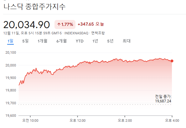 2024년 12월 11일(현지시간), 미국 기술주 중심의 나스닥 지수가 역사적인 순간을 맞이했습니다. 이날 오후 12시 13분(미 동부시간), 나스닥 종합주가지수는 20,025.01을 기록하며 사상 처음으로 2만 선을 돌파했습니다.